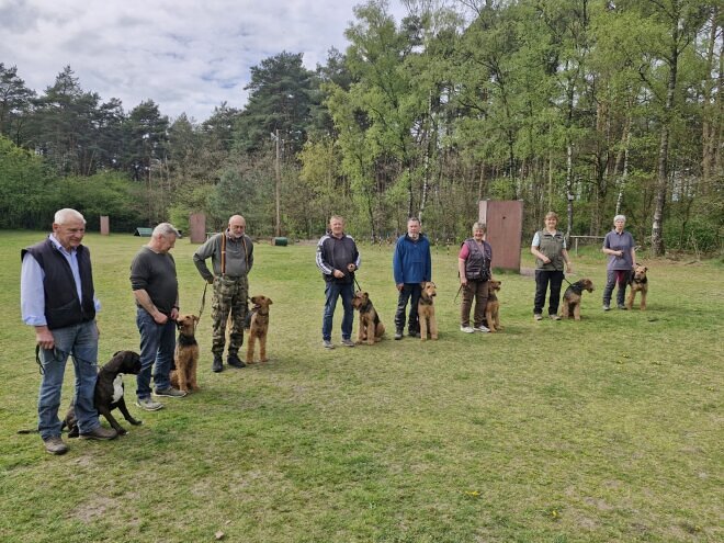 Acht Airedale Terrier und ein Boxer stellten sich den aufmerksamen Augen von der Leistungsrichterin Angelika Heimann. Bei der Nachbesprechung erläuterte sie die Fehler und erklärte ausführlich ihre Punktebewertung.